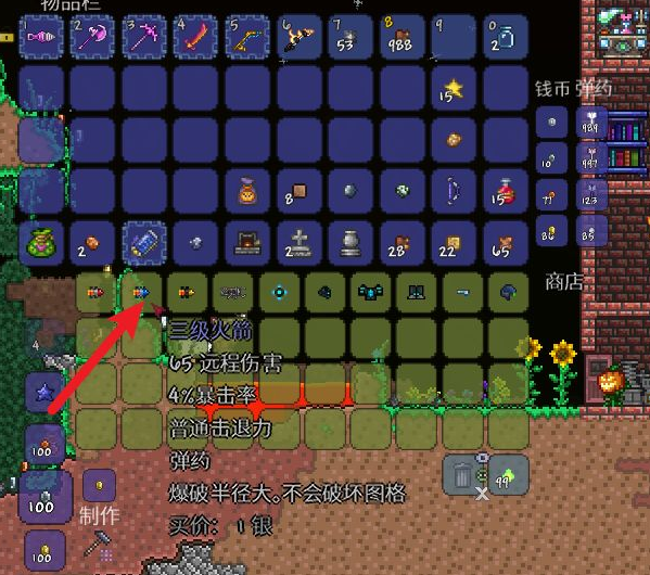 在泰拉瑞亞遊戲中,我們擊敗世界花後讓機器俠入住,在日食或夜晚的時候打開機器俠的商店,可以用1個銀幣購買三級火箭。