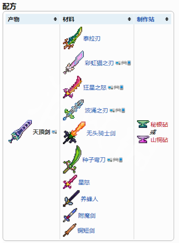 首頁 泰拉瑞亞 問答 泰拉瑞亞如何快速獲得天頂劍? 2022-10-15 作為遊戲內的終極武器,天頂劍的獲取方法也非常特殊,需要用九把武器合成後才能獲得。這九把劍分別是泰拉刃、彩虹喵之刃、狂星之怒、波涌之刃、無頭騎士劍、種子彎刀、附魔劍、星怒和銅短劍。
