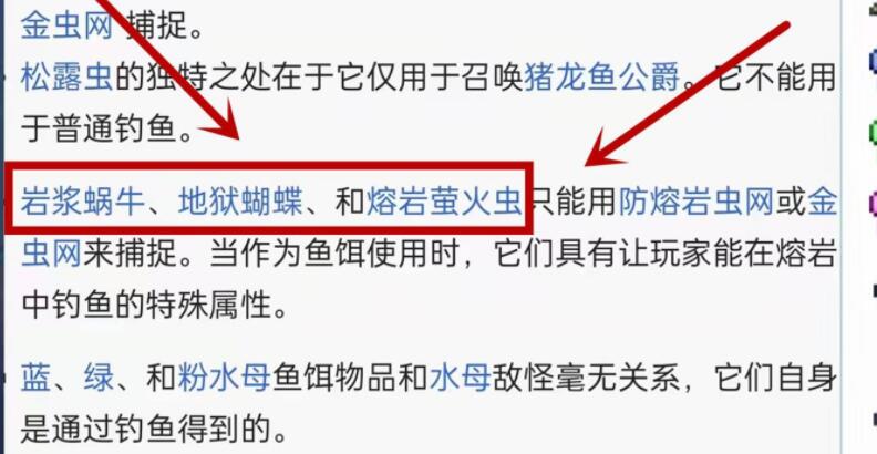 3、只有使用防熔岩蟲網才能捕捉到地獄魚餌岩漿蝸牛、地獄蝴蝶和熔岩螢火蟲,使用這三種魚餌即可讓玩家在地獄岩漿里釣魚,魚竿任意均可。