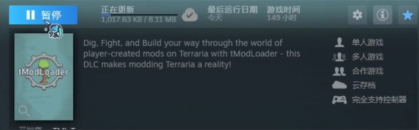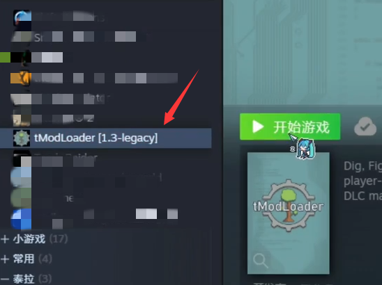 2、更新tModLoader,此時在steam庫中 tModLoader後會添加[1.3-legacy]後綴,如果有就代表成功,就可以正常遊玩1.3了。