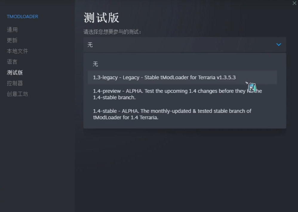 1、近期模組更新tMOdLoader1.4導致無法遊玩,我們換回1.3就可以正常遊玩了。操作步驟:打開steam,右鍵tModLoader--屬性--測試版。選擇 1.3-legacy - -Legacy - -Stable tModLoader for Terraria v1.3.5.3