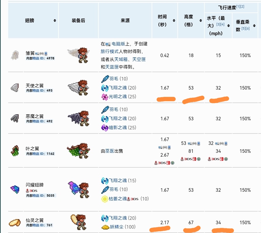 仙靈之翼是一個很不錯的翅膀,他在困難模式前期易於製作,他的飛行時長比天使之翼惡魔之翼都要高,飛行的高度達到67個物塊,具有較強的機動性,仙靈之翼一般可以一直使用到世紀之花以後,當你在日食事件當中打敗了蛾怪,可以用蛾怪之翼來替換它。