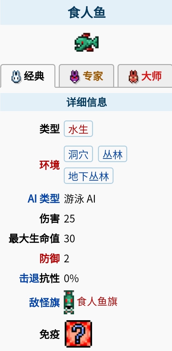 首頁 泰拉瑞亞 問答 泰拉瑞亞血腥食人魚在哪釣? 2022-10-17 在泰拉瑞亞這款游戲中,食人魚是一種敵怪,可在叢林和地下叢林生物群落中和洞穴層中的水塘內找到它們,在叢林生物群落中它們的常見度會翻倍