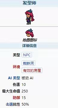 首頁 泰拉瑞亞 問答 泰拉瑞亞理髮師在哪? 2022-10-17 理髮師位置介紹:在遊戲《泰拉瑞亞》中,在地下蜘蛛洞內找到被縛的造型師,對話後解救,有有效的房間即可入住,作用是給玩家提供改變發型或顏色的服務。