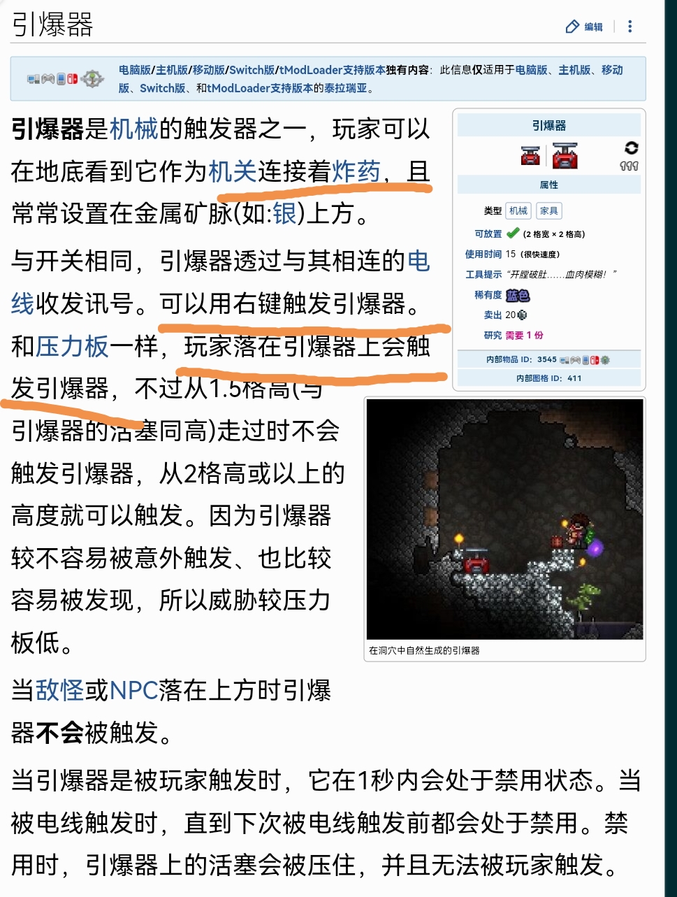 引爆器引爆一共有兩種方法,一是直接點擊引爆器,它就會引爆炸彈,第2種方法是玩家控制角色,直接踩到引爆器上也會引爆炸彈。一般引爆器會生成在各種礦物上,玩家可以通過引爆器引爆用電線連接著的炸葯從而獲得大量礦石,但是要注意距離,否則也有可能會導致玩家死亡。