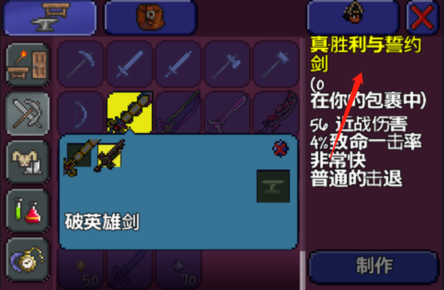 首頁 泰拉瑞亞 問答 泰拉瑞亞勝利與誓約之劍怎麼做? 2022-10-17 泰拉瑞亞勝利誓約之劍是在秘銀砧或者山銅砧製作而成的,材料是12個神聖錠,神聖錠是由雙子魔眼、機械骷髏、和鋼鐵毀滅者掉落的。集齊材料後就可以在秘銀砧或山銅砧上製造出勝利與誓約之劍。