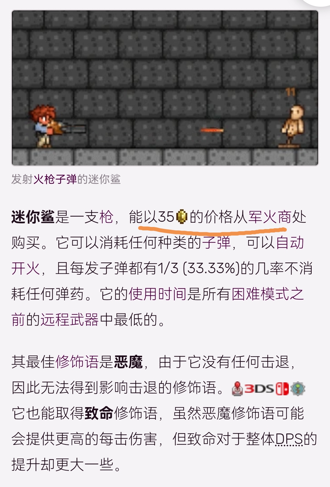 迷你鯊在軍火商處就可以獲得,軍火商會以35個金幣的價格賣給你,迷你鯊可以用來合成星辰炮或者是巨獸鯊,但是迷你沙在困難模式前期的用處其實不大,因為它的價格對於新人而言是很高的了,當你攢夠35個金幣時,一般情況下你已經有更好的替代物品了。