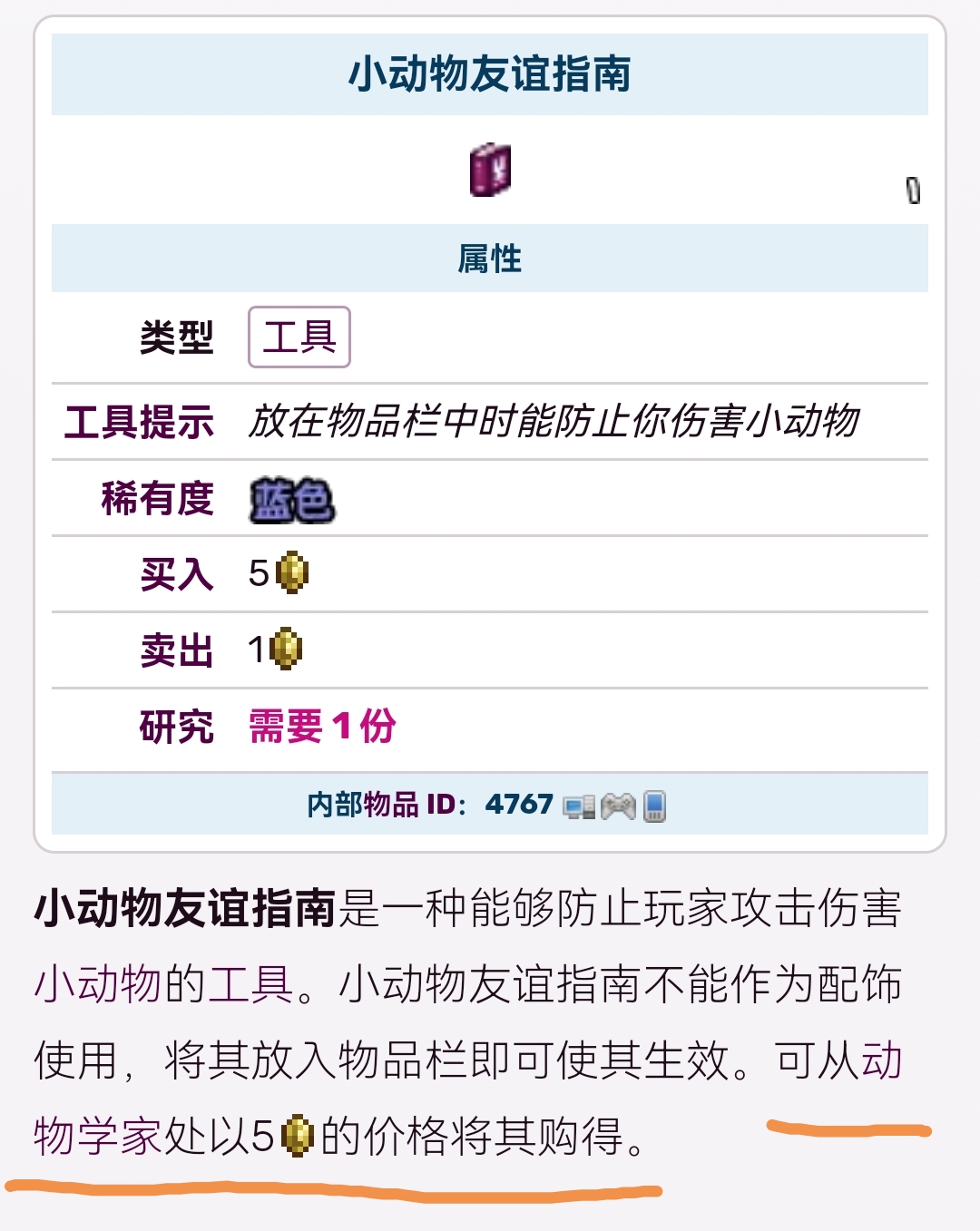 首頁 泰拉瑞亞 問答 泰拉瑞亞小動物友誼指南怎麼獲得? 2022-10-18 小動物友誼指南是玩家以5個金幣的價格,在動物學家處進行購買的。它的作用是能夠讓你不傷害小動物,也就避免了玩家不小心攻擊七彩草蛉,而召喚出光之女皇。