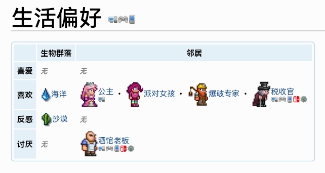 漁夫喜歡和公主,派對女孩,爆破專家,稅收官做鄰居。他討厭和酒館老闆做鄰居,喜歡海洋的生物群落,討厭沙漠的生物群落。