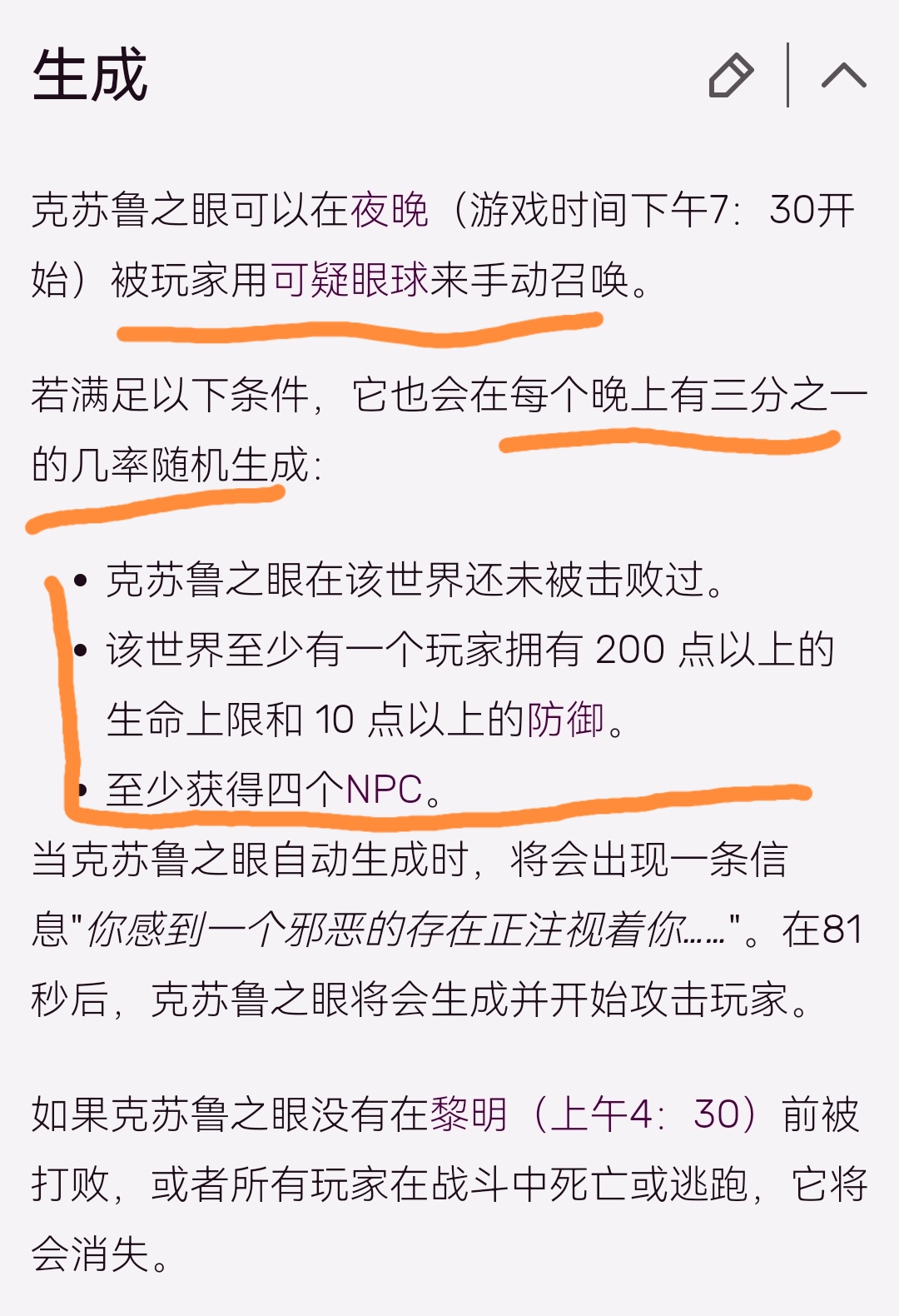 克蘇魯之眼可以用召喚物品克蘇魯之眼(在地下寶箱當中可以找到,這個物品是不可合成的)進行召喚,在晚上7:30之後。在玩家從未殺死過克蘇魯之眼,並且擁有4個NPC,至少200點的生命值和10點的防禦,那麼他每個晚上都有1/3的幾率生成。
