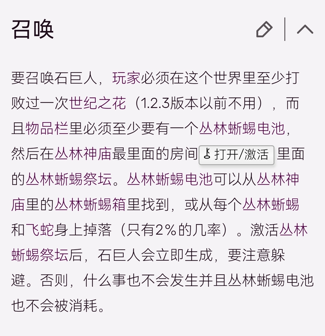 召喚石巨人的前置要求是你先要打敗世紀之花,然後進入神廟後你要有叢林蜥蜴電池放在背包當中,此時到叢林神廟的最深處找到叢林祭壇,準備好之後直接點擊祭壇,就可以召喚出石巨人了。叢林蜥蜴電池可以在神廟的寶箱當中找到,也可以由叢林蜥蜴或者飛蛇掉落。