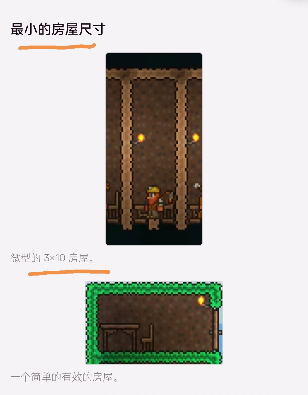 首頁 泰拉瑞亞 問答 泰拉瑞亞最小房子規格是多少? 2022-10-22 最小的房子也需要3×10的規模,要求有10個方塊的高度,三個方塊的寬度,這才是一個合格房子的最低規格要求,但是一個合格的房子,他還要求需要有椅子,工作台或者木桌,有效的牆壁,還要有照明源火把,還有一個門才可以讓NPC住進來。