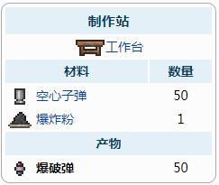 首頁 泰拉瑞亞 問答 泰拉瑞亞爆破彈怎麼做? 2022-10-22 1.爆破彈是肉山後才能獲得一種子彈,玩家可以通過合成獲得。2. 合成獲得:在工作台處,用50個空心子彈 1個爆炸粉,可以獲得50個爆破彈。