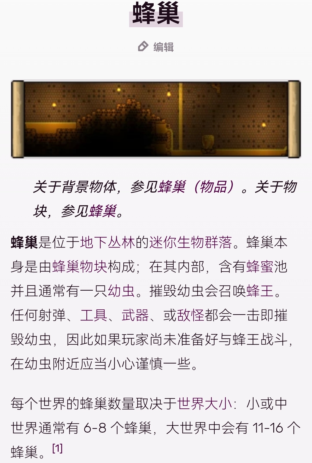 在地下叢林當中可能存在蜂巢,蜂巢它是隨機出現的,它並沒有具體的地下深度,不同世界的蜂巢,它的深度是不同的,也存在一個世界,到處都是蜂巢的情況,但是每個世界生成蜂巢的數量是不同的小世界和中世界通常有 6-8 個蜂巢,大世界中會有11-16 個蜂巢。