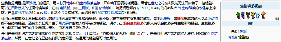 首頁 泰拉瑞亞 問答 泰拉瑞亞為什麼叢林鑰匙用不了? 2022-10-23 叢林鑰匙用不了的原因是你沒有滿足使用它的條件,玩家獲得叢林鑰匙之後,要在打敗世紀之花後才能夠使用,才能夠去地牢當中開叢林寶箱。