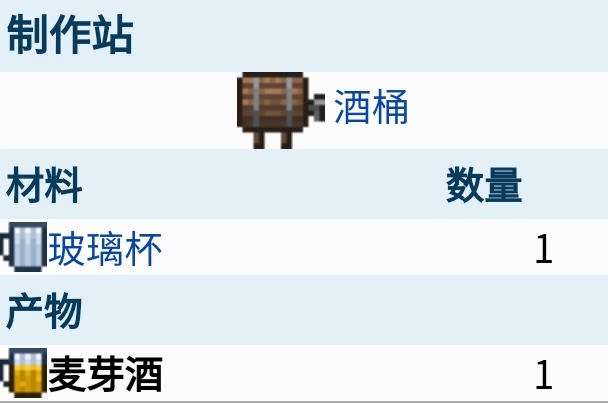 在泰拉瑞亞這款遊戲中,玩家如果想獲得麥芽酒的話可以使用玻璃杯在酒桶這個製作站合成獲得,在遊戲中麥芽酒是一種藥水。