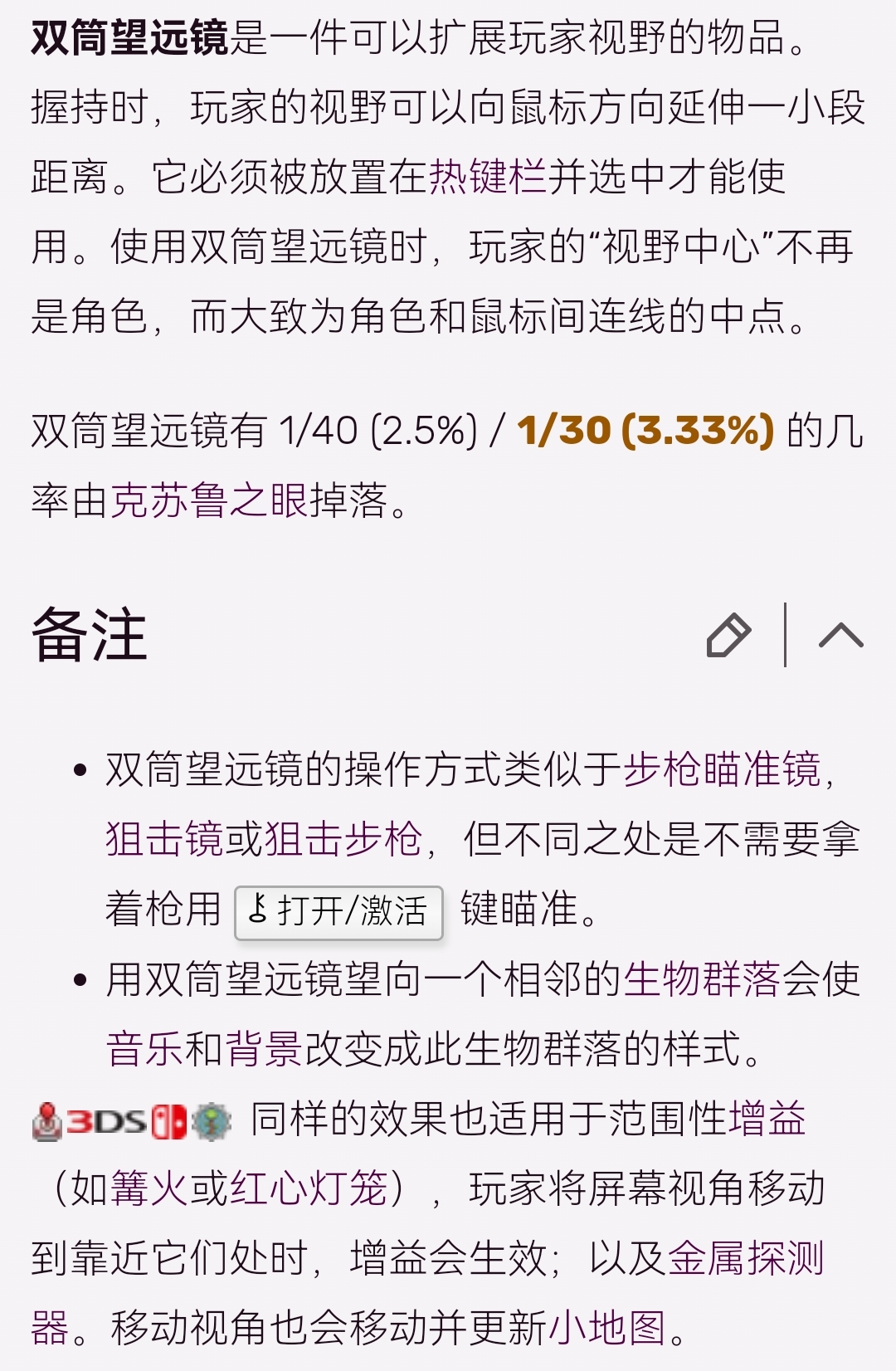 首頁 泰拉瑞亞 問答 泰拉瑞亞雙筒望遠鏡有什麼用? 2022-10-25 雙筒望遠鏡是一件可以擴展玩家視野的物品。握持時,玩家的視野可以向滑鼠方向延伸一小段距離。它必須被放置在熱鍵欄並選中才能使用。使用雙筒望遠鏡時,玩家的「視野中心」不再是角色,而大致為角色和滑鼠間連線的中點
