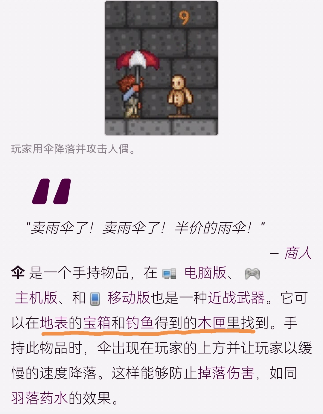 首頁 泰拉瑞亞 問答 泰拉瑞亞雨傘怎麼獲得? 2022-10-26 傘 是一個手持物品,在電腦版、移動版也是一種近戰武器。它可以在地表的寶箱和釣魚得到的木匣里找到。手持此物品時,傘出現在玩家的上方並讓玩家以緩慢的速度降落。這樣能夠防止掉落傷害,如同羽落藥水的效果。