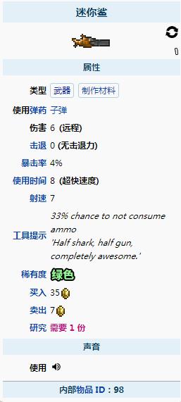 首頁 泰拉瑞亞 問答 泰拉瑞亞迷你鯊怎麼做? 2022-10-27 【泰拉瑞亞】游戲中迷你鯊是一種槍,玩家可以在軍火商處用35金購買獲得,可以搭配任何形式的子彈,每次射擊都有1/3(33.3%)幾率不消耗任何彈葯。它的使用時間是困難模式之前所有遠程武器中最快的。最好的前綴是惡魔或致命。