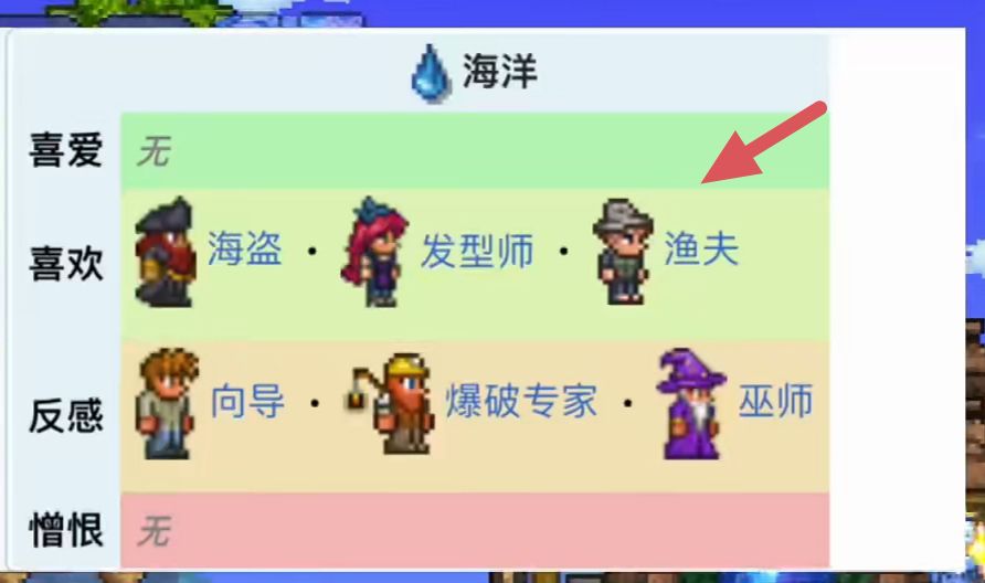 首頁 泰拉瑞亞 問答 泰拉瑞亞誰住海邊? 2022-10-27 喜歡海洋的NPC有三個,海盜、漁夫、發型師,但是在塔拉雷亞海的就只有海盜和漁夫,其中漁夫他喜歡睡在海邊或沙灘上。如果你和他說話,叫醒他,並且有房間,他會入住。