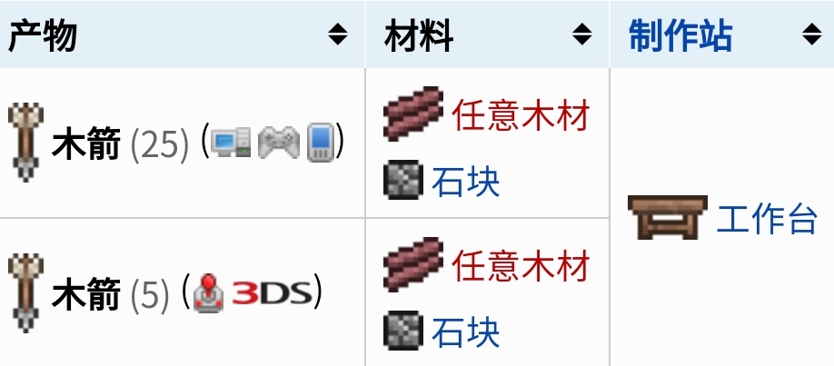 在泰拉瑞亞這款遊戲里,玩家如果想獲得木箭,可以使用任意木材和石塊在製作工作台處製造而成,木箭是遊戲中最弱的箭。