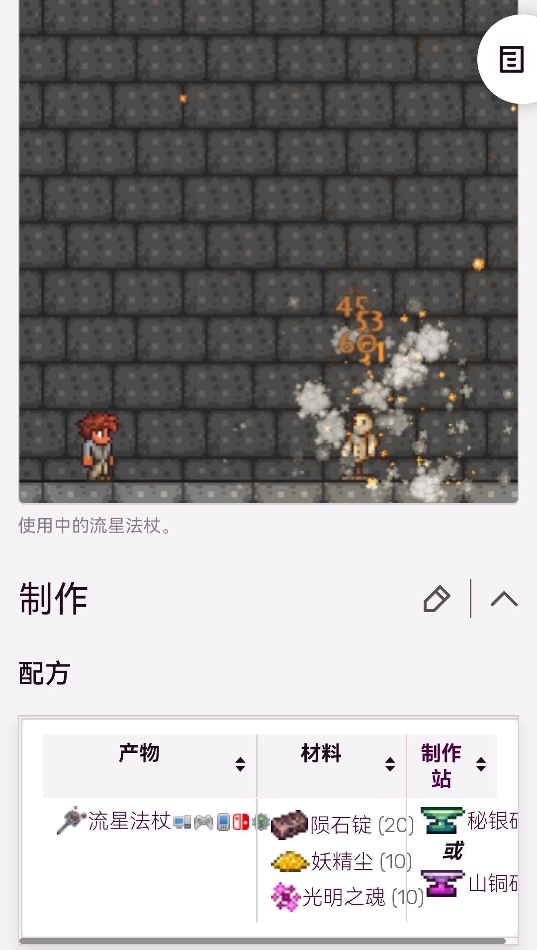 首頁 泰拉瑞亞 問答 泰拉瑞亞隕石法杖怎麼做? 2022-10-27 流星法杖需要20個隕石錠,10個流妖精塵,10個光明之魂進行製作。他是一把魔法武器,根據點擊的位置,可以從天空中墜落星星來進行攻擊,對周圍的地塊造成50點的魔法傷害。可以根據滑鼠的位置從天空墜落星星進行攻擊。