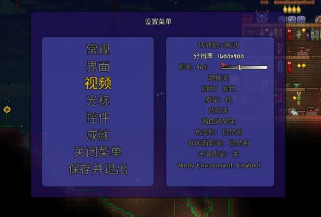 首頁 泰拉瑞亞 問答 泰拉瑞亞怎麼把游戲畫面縮小? 2022-10-28 1.首先進入遊戲之後按下Esc按鍵,點擊設置。2.然後選擇視頻一欄。3.接著去點擊修改解析度,然後畫面界面就會隨著自己的設置縮小或者變大了。