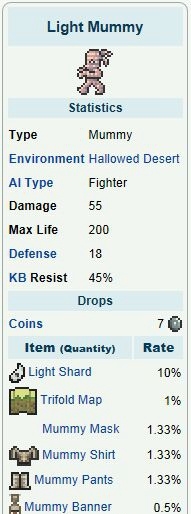 首頁 泰拉瑞亞 問答 泰拉瑞亞光明木乃伊在哪找? 2022-10-30 一、黑暗和光明木乃伊可以被圈養在腐化或神聖的沙漠裡面,或人工做出的沙漠。二、需要的只是壹個屏幕寬的神聖/腐化環境。然而,不要讓這兩個地方太接近,否則會被抵消的。