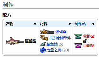 巨獸鯊的合成方式是用一個迷你鯊和一個非法槍械部件,還有5個鯊魚鰭和20個力量之魂,在秘銀砧或山銅砧處進行合成。巨獸鯊的合成方式從1.2~1.4都沒有變過,他是在世紀之花之前最強的槍之一,它具有超快的發射速度,並且有50%的幾率不消耗彈葯。
