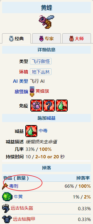 首頁 泰拉瑞亞 問答 泰拉瑞亞毒刺在哪? 2022-10-30 毒刺是一種製作材料,有 66%幾率掉落自出現在地下叢林生物群落中的黃蜂。毒刺在大多數叢林主題的製作配方中都有用到。除了消耗性物品外,製作所有物品需要33個毒刺。