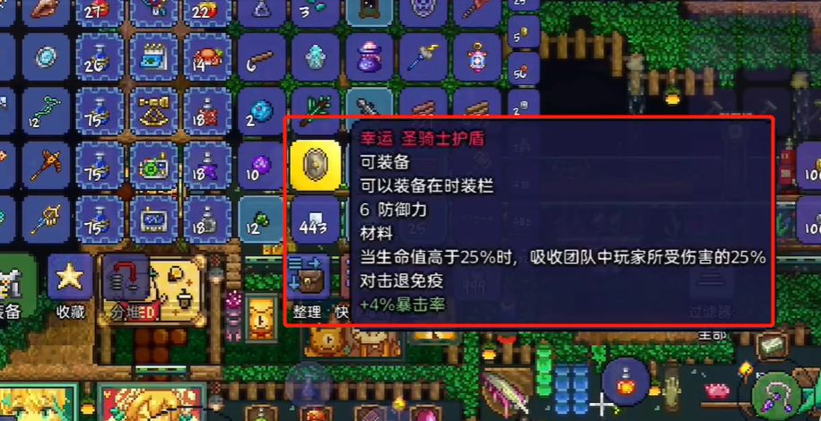 首頁 泰拉瑞亞 問答 泰拉瑞亞冰之庇護怎麼獲得? 2022-10-30 1、首先在地牢擊殺聖騎士,獲取聖騎士護盾;如下圖所示:2、接著在雪地環境擊殺冰凍海龜,獲取冰凍海龜殼;如下圖所示:3、最後點擊製作,即可獲得冰之庇護。如下圖所示: