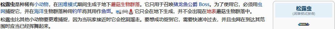 豬鯊公爵的召喚物是松露蟲,松露蟲並不是通過製作得到的,它是通過捕捉得到的,玩家可以在發光的蘑菇生物群落當中捕捉到松露蟲,松露蟲會在困難模式中生成,在發光的蘑菇生物群落當中,玩家只需要用蟲網就能夠捕捉它了,不過速度要快,松露蟲也是會逃走的。