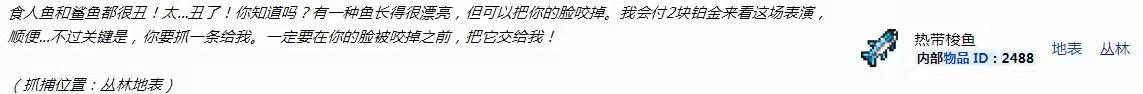 首頁 泰拉瑞亞 問答 泰拉瑞亞熱帶梭魚怎麼獲得? 2022-10-31 熱帶梭魚獲得方法介紹:在遊戲《泰拉瑞亞》中,玩家可以在叢林地貌的地圖中的地表區域找到河流,在這里釣魚有一定的概率可以釣到熱帶梭魚,還可以通過釣到這種魚來完成對應的漁夫任務。