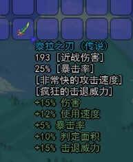 遊戲中泰拉之刃為傳說級武器,近戰傷害高達193,暴擊率為25%,對戰中還能增加12%的使用速度和10%的判定面積,有著非常快的攻擊速度和瘋狂的擊退威力,這就是泰拉之刃的具體屬性。