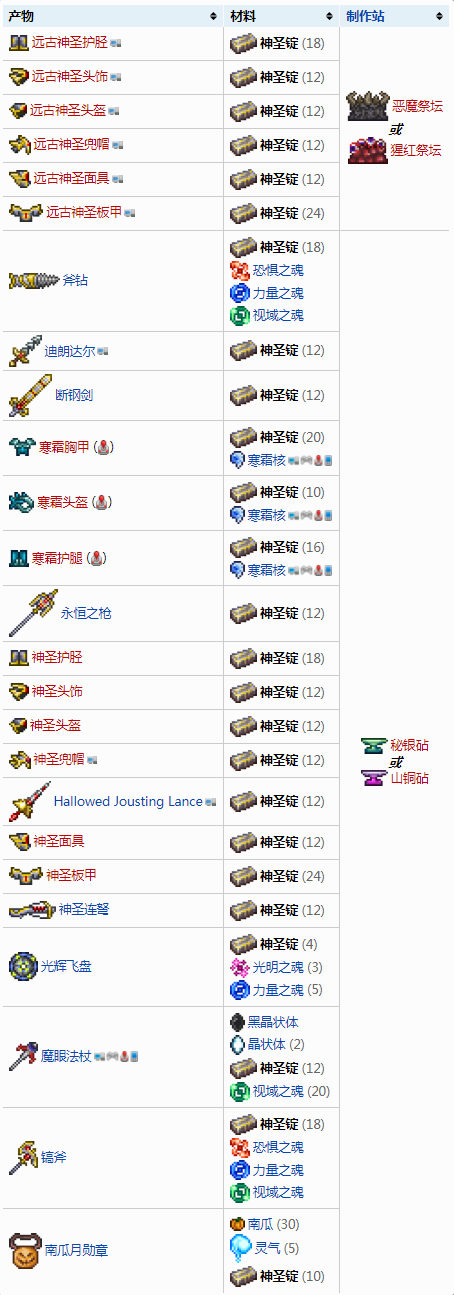 首頁 泰拉瑞亞 問答 泰拉瑞亞神聖錠做什麼最好? 2022-11-01 泰拉瑞亞神聖錠是遊戲中非常珍貴的一種合成材料,只有擊敗了機械繫BOSS之後才能獲得。神聖錠主要用來合成武器和盔甲,建議大家優先合成合成神聖套裝。神聖錠可合成物品如下: