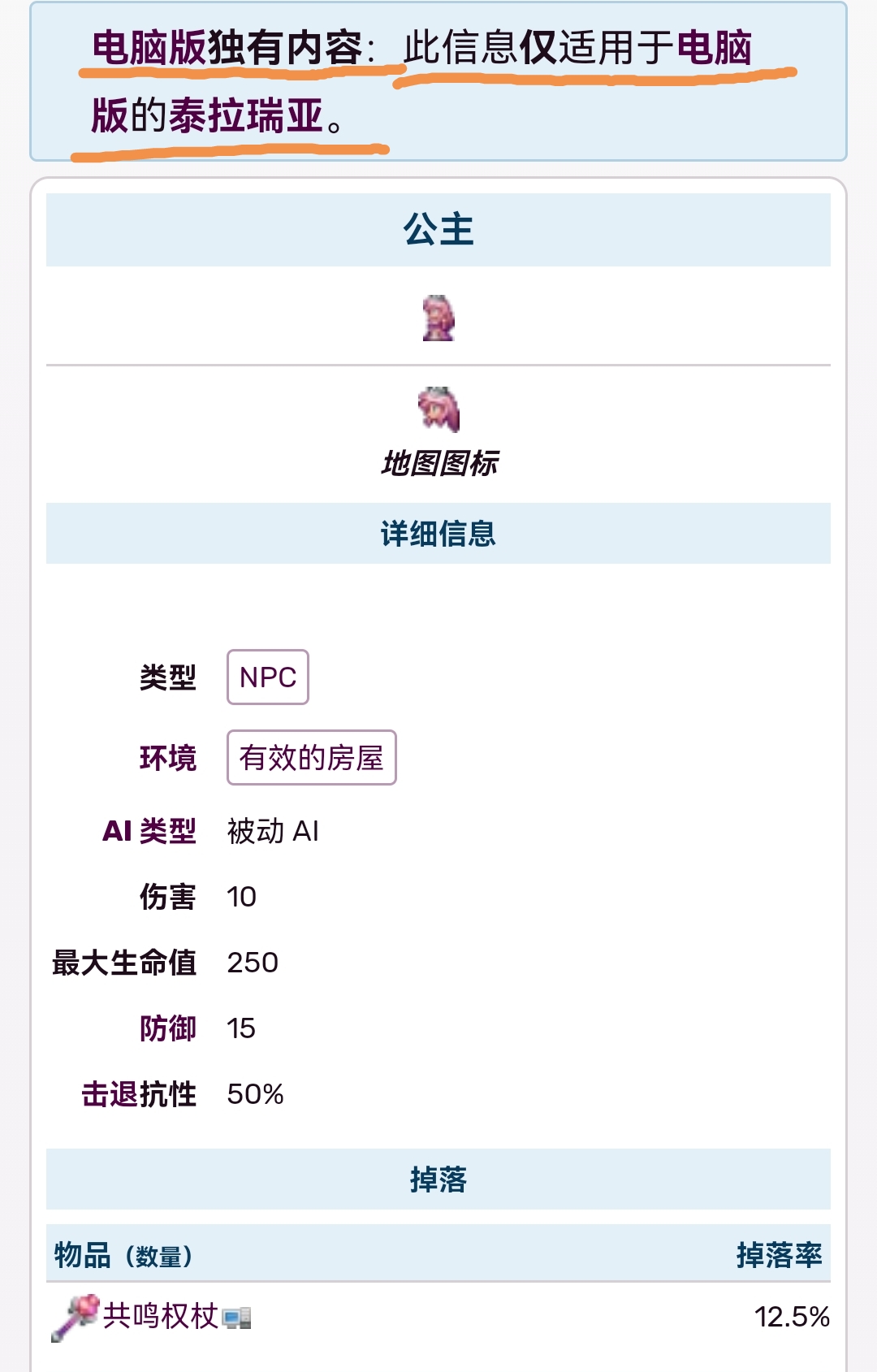 首頁 泰拉瑞亞 問答 泰拉瑞亞手機版有公主嗎? 2022-11-02 公主是商販型NPC,它必須在所有NPC都到達之後,也就是曜在打敗世紀之花之後,機械俠已經到達的情況下,此時還擁有空房間,她才會到達。公主NPC是電腦版獨有的NPC,而移動版是沒有的。