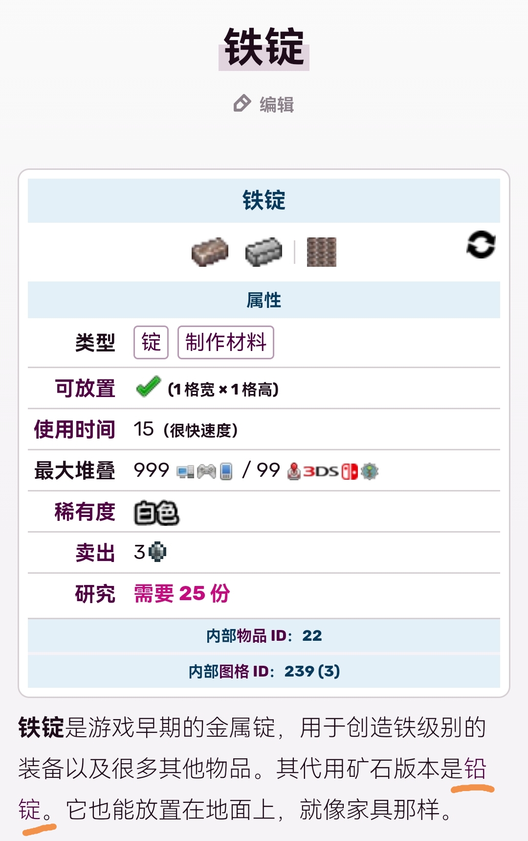 首頁 泰拉瑞亞 問答 泰拉瑞亞鐵錠可以用什麼代替? 2022-11-02 鐵錠是泰拉瑞亞困難模式前期當中的製作材料,和它具有同等價值的代替材料是鉛錠,因為鐵錠和鉛錠是兩種不同的材料,在一個世界當中一般只會生成其中一種,兩者是等價的材料,能用鐵錠製作的,用鉛錠同樣也可以製作。