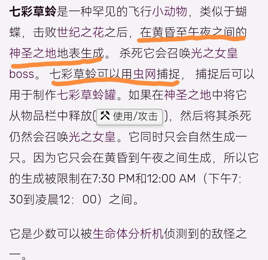 首頁 泰拉瑞亞 問答 泰拉瑞亞光之女皇召喚物怎麼找? 2022-11-02 七彩草蛉是一種罕見的飛行小動物,類似於蝴蝶,擊敗世紀之花之後,在黃昏至午夜之間的神聖之地地表生成。 殺死它會召喚光之女皇boss。 七彩草蛉可以用蟲網捕捉, 捕捉後可以用於製作七彩草蛉罐。