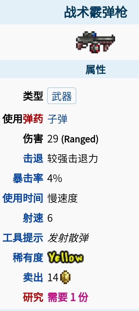 首頁 泰拉瑞亞 問答 泰拉瑞亞戰術霰彈槍怎麼獲得? 2022-11-04 戰術霰彈槍是一種困難模式下、世紀之花後的遠程武器。它可以視作霰彈槍的升級版,每次連續發射六顆子彈,但只消耗一顆子彈(霰彈槍每次只有4發)並且可能一次性造成174點總傷害