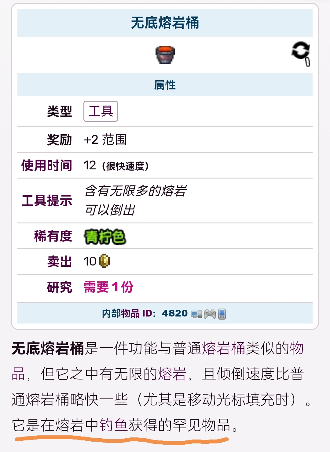 首頁 泰拉瑞亞 問答 泰拉瑞亞無盡岩漿桶怎麼做? 2022-11-06 無盡岩漿桶是不可以製作的一個物品,無盡岩漿桶沒有辦法製作,它是通過釣魚獲得的,你在地獄裡面的釣魚有極小的幾率獲得無盡岩漿桶,所以個人建議不要為它耗費精力。除了無盡岩漿桶外還有無盡水桶,無盡水桶是在漁夫任務當中,漁夫可能給你的。
