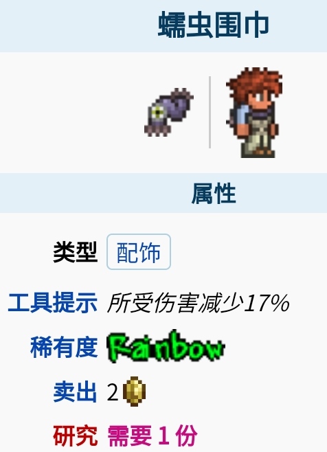 在泰拉瑞亞這款游戲中,蠕蟲圍巾是一種專家模式 配飾,它能給玩家17%的傷害減免,在游戲中它只能在世界吞噬怪掉落的寶藏袋中找到