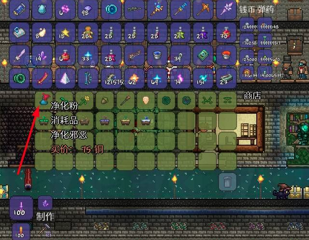 1、首先我們靠近樹妖NPC,開啟商店,購買凈化粉。如下圖所示: