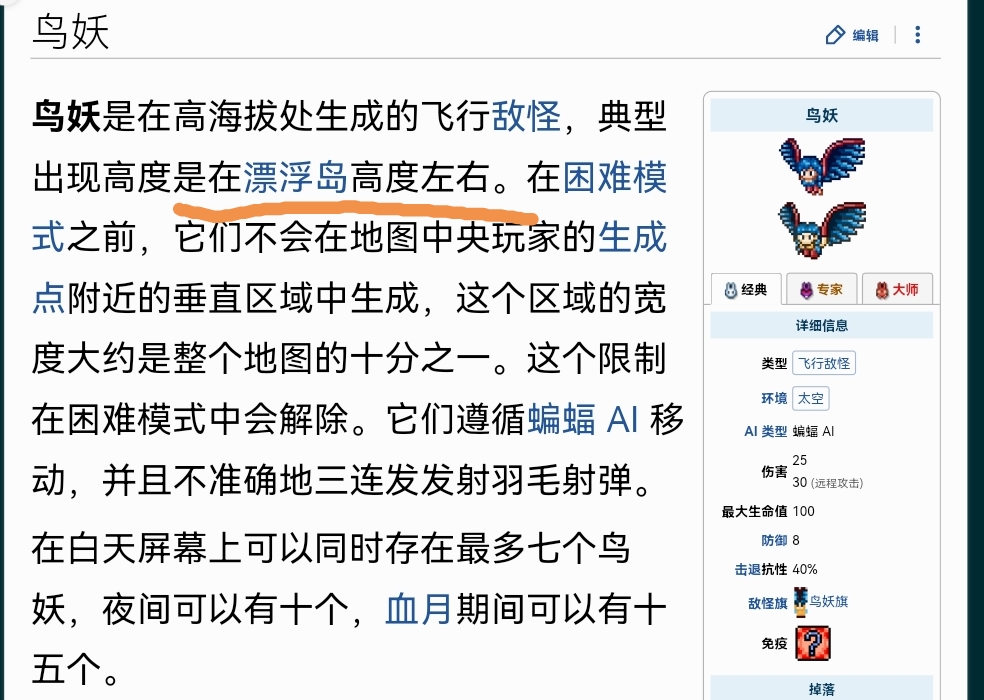 首頁 泰拉瑞亞 問答 泰拉瑞亞鳥妖刷新條件是什麼? 2022-11-07 玩家的飛行高度只有達到了浮空島左右就會刷出鳥妖,在困難模式之前地圖1/10大小的中央區域是不會刷出鳥妖的,但是困難模式之後這個限制就解除了。
