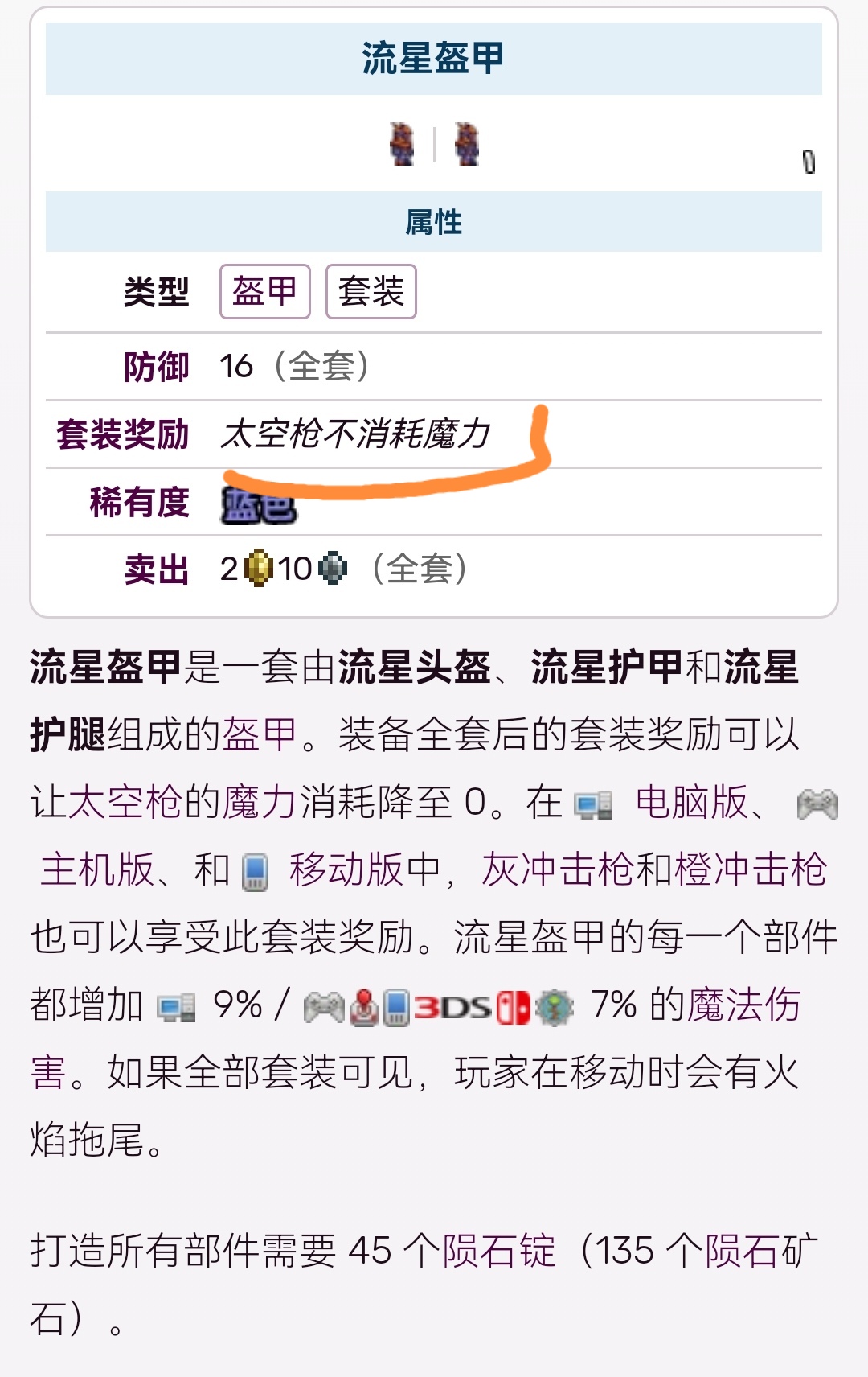 首頁 泰拉瑞亞 問答 泰拉瑞亞隕石套防火嗎? 2022-11-08 隕石套裝應該叫做流星盔甲,流星盔甲的套裝作用不是防火,所以它並不能防火。流星盔甲是一套由流星頭盔、流星護甲和流星護腿組成的盔甲。裝備全套後的套裝獎勵可以讓太空槍的魔力消耗降至 0。