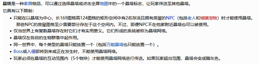 首頁 泰拉瑞亞 問答 泰拉瑞亞傳送塔使用條件是什麼? 2022-11-08 傳送晶塔的使用條件是周圍要有兩個NPC,在晶塔範圍內就可以傳送了,需要注意的是晶塔只能放在各自的生物群落當中,在boss或者事件入侵時不能使用晶塔,在一個世界當中,同一類型的金塔只能放置一個。
