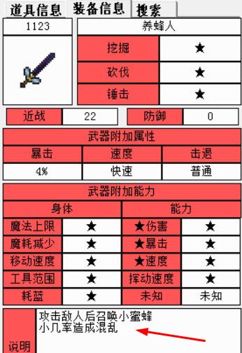 養蜂人攻擊的時候召喚一隻殺人蜂造成12傷害(1-3隻蜜蜂,每次12次傷害),並且有10%幾率造成混亂。
