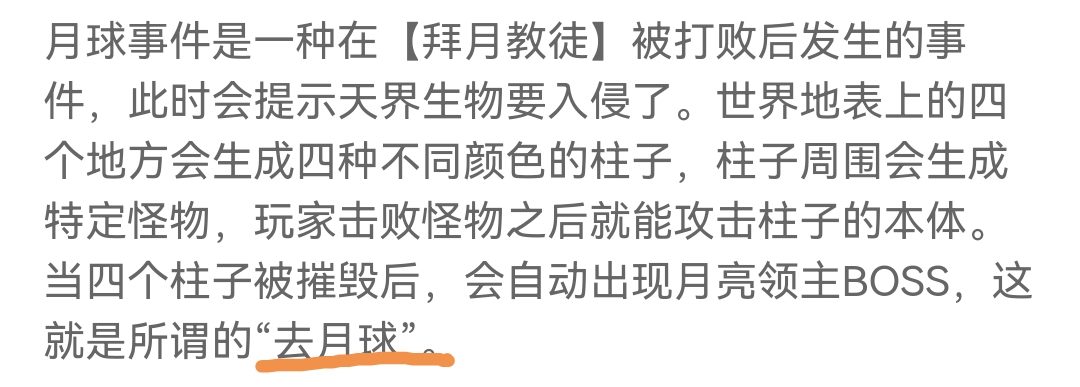 去月球世界並不是指玩家到達了月球世界,而是指月亮領主boss來到了泰拉瑞亞世界當中,也就是說當拜月教徒被打敗之後,天界生物入侵了,並且將4個柱子都摧毀之後,生成月亮領主時,就是所謂的去月球世界,當然現在你也可以用天界符直接召喚出月亮領主boss。