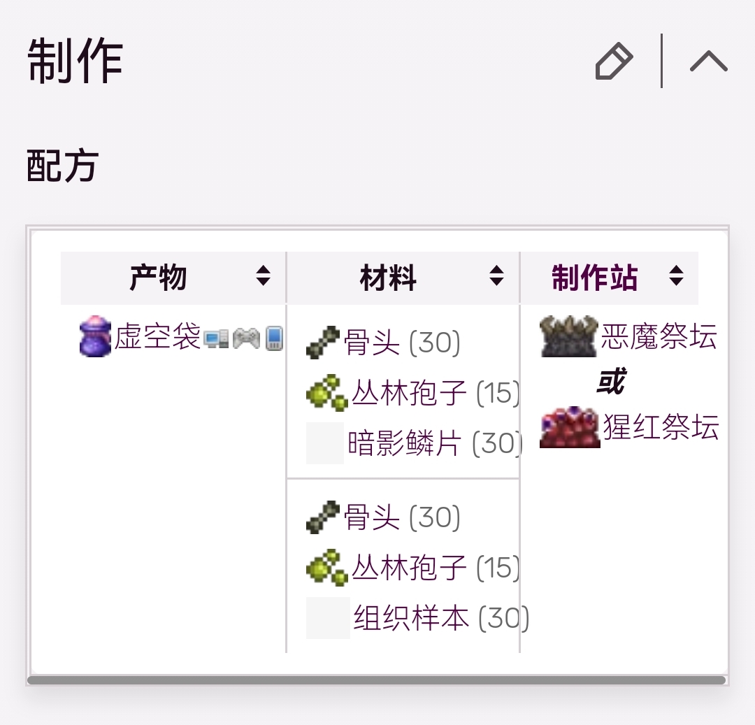 首頁 泰拉瑞亞 問答 泰拉瑞亞虛空背包在哪裡合成? 2022-11-09 虛空背包是在惡魔祭壇或者猩紅祭壇處進行製作的。虛空背包在猩紅世界當中需要15個叢林孢子,30個骨頭,還有30個組織樣本進行製作。在腐化世界當中需要15個叢林孢子,30個骨頭,還有30個暗影鱗片進行製作。
