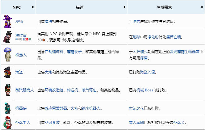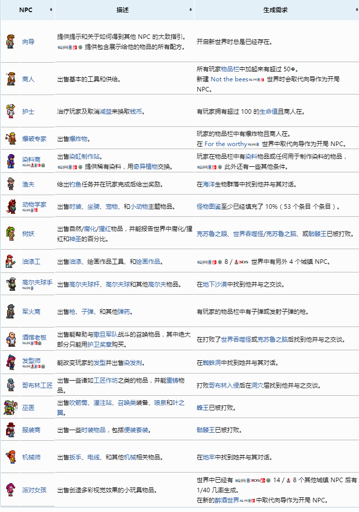 首頁 泰拉瑞亞 問答 泰拉瑞亞手游npc入住條件是什麼? 2022-11-09 1、在困難模式之前,共有18名NPC可以入住,具體入住條件如下。2、在困難模式之後,共有7名NPC可以入住,入住條件如下圖所示。