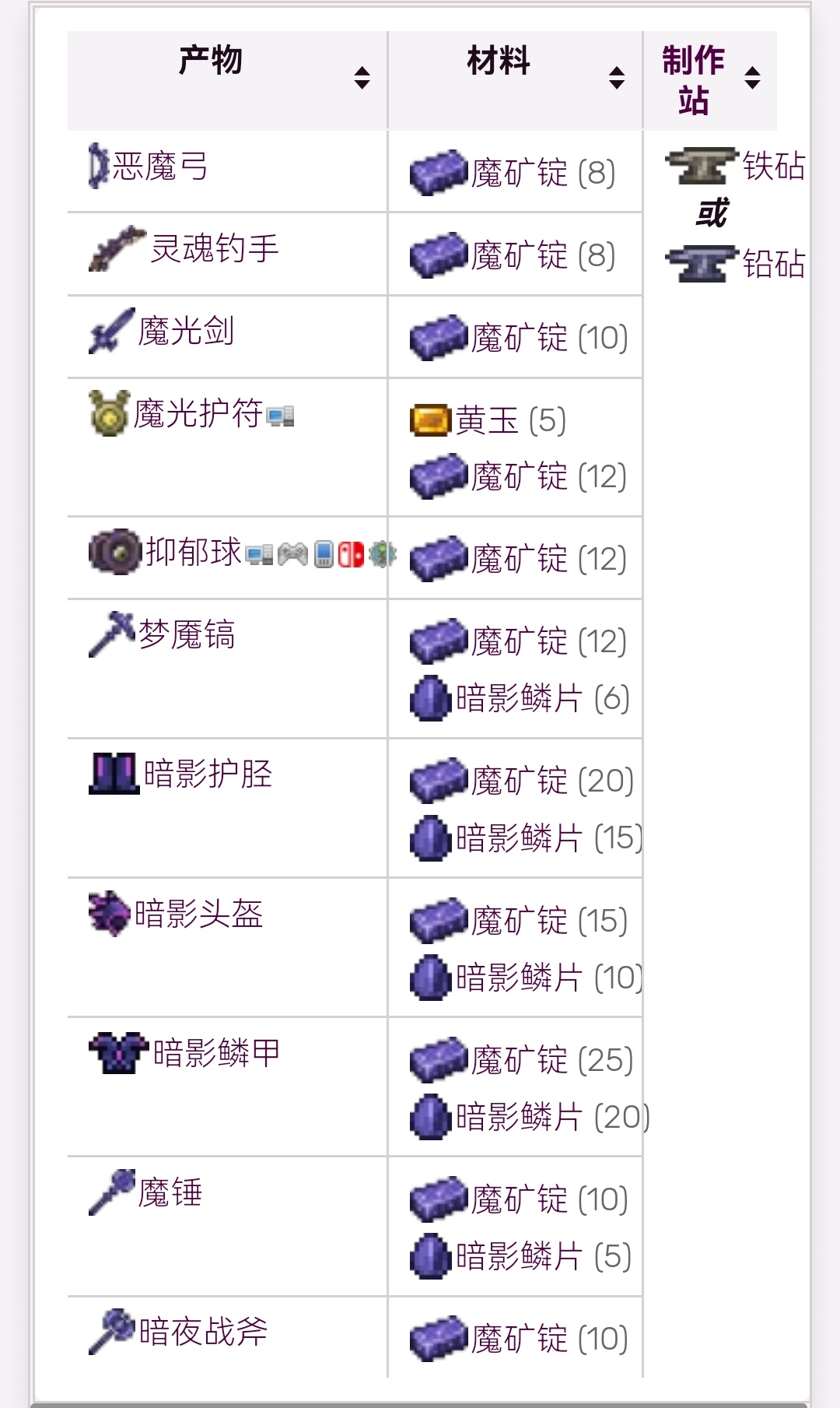 首頁 泰拉瑞亞 問答 泰拉瑞亞魔礦的合成表有哪些? 2022-11-09 魔礦錠是困難模式之前的錠。製作大多數涉及魔礦的物品都需要先將魔礦製成錠。它們是用魔礦在熔爐處製作的。魔礦錠在製作站處可以合成惡魔弓,靈魂釣竿,魔光劍,魔光護符,抑鬱球夢魘鎬,暗影套裝,魔錘和暗夜戰斧。